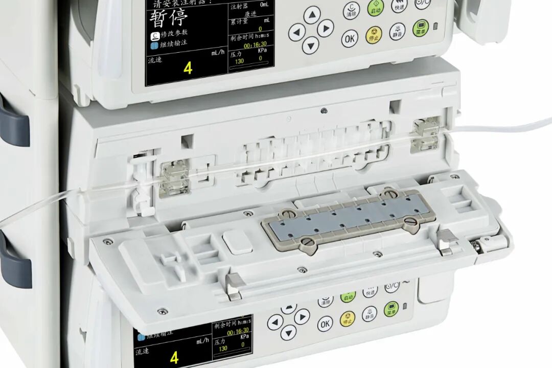 设备内置药物库系统,预存百余种药物参数并设置剂量阈值报警。当输注剂量超出安全范围时,系统通过顶部与单泵外侧的声光报警装置同步警示,配合双CPU安全检测机制,确保医护人员快速响应。指纹认证功能支持1-5分钟自动锁定,仅授权人员可操作,从流程上杜绝误操作风险。